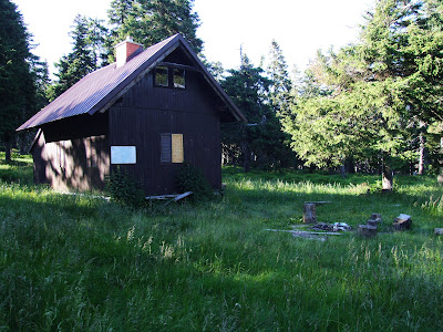 Po žebříku se z polní cesty vyšplháme nahoru a ve tmě jdeme ... pomaličku stoupáme ... místy se ztrácejí pěšinkou (zarostlou převážně borůvčím a také místy plnou polomů) asi 1/2 hodiny až k lovecké chatě Podbělka.